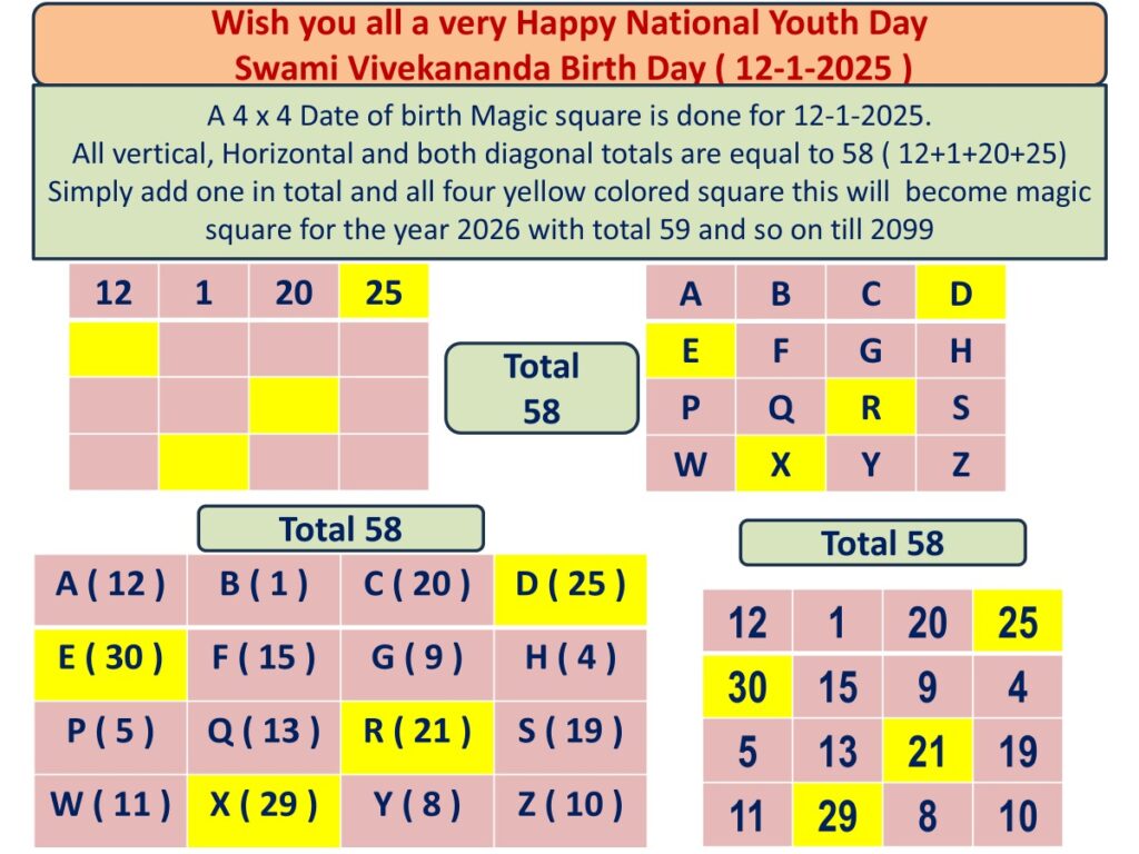 Waaaaw!!! You have got the magic square for 12 – 1 -2025, with all vertical, Horizontal and Both diagonal totals are 58.